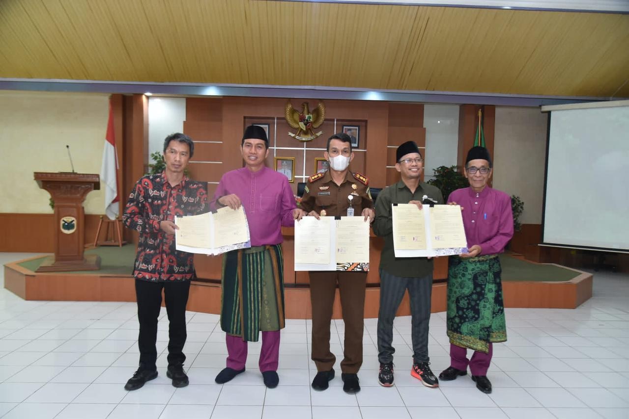 Pemerintah Kabupaten Batanghari, Bupati Fadhil Arief menanda tangani tiga nota kesepakatan dengan sejumlah pihak di Ruang Pola Besar Kantor Bupati Batanghari, (22/11). Kesepakatan dibuat bersama Kantor Bahasa Provinsi Jambi, PT. Restorasi Ekosistem Indonesia dan Kejaksaan Negeri Batanghari.