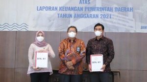 Pemerintah Kabupaten Batanghari menerima Laporan Hasil Pemeriksaan (LHP) dari Badan Pemeriksa Keuangan (BPK) Perwakilan Jambi, atas Laporan Keuangan Pemerintah Daerah (LKPD) Tahun Anggaran 2021, (18/5), di Aula Kantor BPK Jambi.