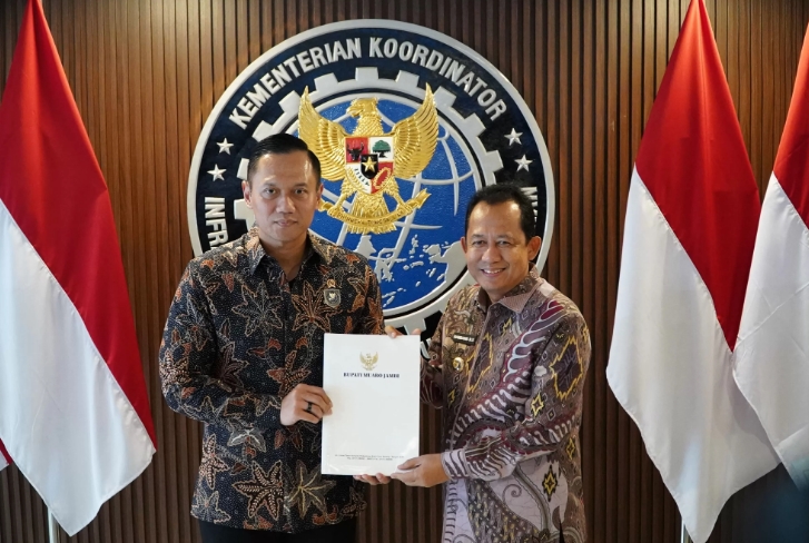 Bupati Muaro Jambi, Dr. Bambang Bayu Suseno, SP, MM, M.Si, melakukan audiensi resmi dengan Menteri Koordinator Bidang Infrastruktur dan Pembangunan Kewilayahan Republik Indonesia, Mayor Inf. Purn. H. Agus Harimurti Yudhoyono, M.Sc, M.P.A, M.A., di Gedung Kemenko Infrastruktur dan Pembangunan Kewilayahan, Jakarta, Rabu (16/07/2025).