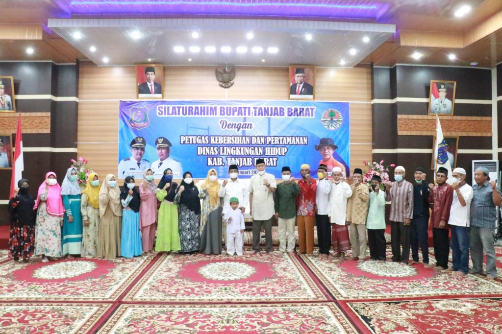 Kuala Tungkal, SDF – Bupati Tanjung Jabung Barat Drs H Anwar Sadat MAg, didampingi Ketua TP PKK Kabupaten Tanjung Jabung Barat Hj Fadhilah Sadat, mengelar silahturahmi bersama Petugas Kebersihan dan Pertamanan Dinas Lingkungan Hidup Kabupaten Tanjung Jabung Barat, Sabtu (22/01).