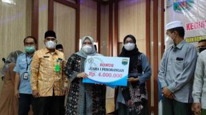 Bupati Muaro Jambi Hj. Masnah Busro hadiri sekaligus serahkan bonus kafilah Musabaqah Tilawatil Qur’an (MTQ) tahun 2022 dalam kesempatan ini juga menyerahkan bantuan biaya berobat pasien keluar daerah dan program pembangunan dari Bank Jambi.