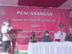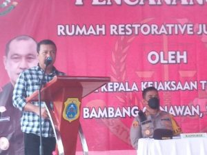 Bupati Tanjung Jabugn Timur, H. Romi Hariyanto, mendampingi Wakil Kepala Kejaksaan Tinggi Jambi Dr. Bambang Gunawan,SH,M.Hum, meresmikan Rumah Restorative Justice (RJ) di Desa TEluk Majelis Kecamatan Kuala Jambi, (07/04).