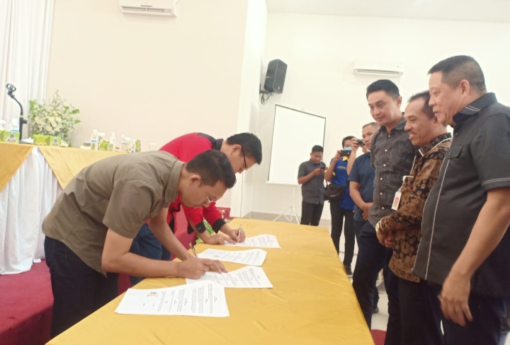 Pj Bupati Muarojambi Bachyuni Deliansyah menghadiri acara penandatanganan Memorandum of Understanding (MoU) Coorporate Social Responsibility antara PT Kurnia Tunggal Nugraha (KTN), PT Erasakti Wira Forestama (EWF) dengan desa-desa yang di Kecamatan Taman Rajo, Kumpeh Ulu dan Kumpeh.