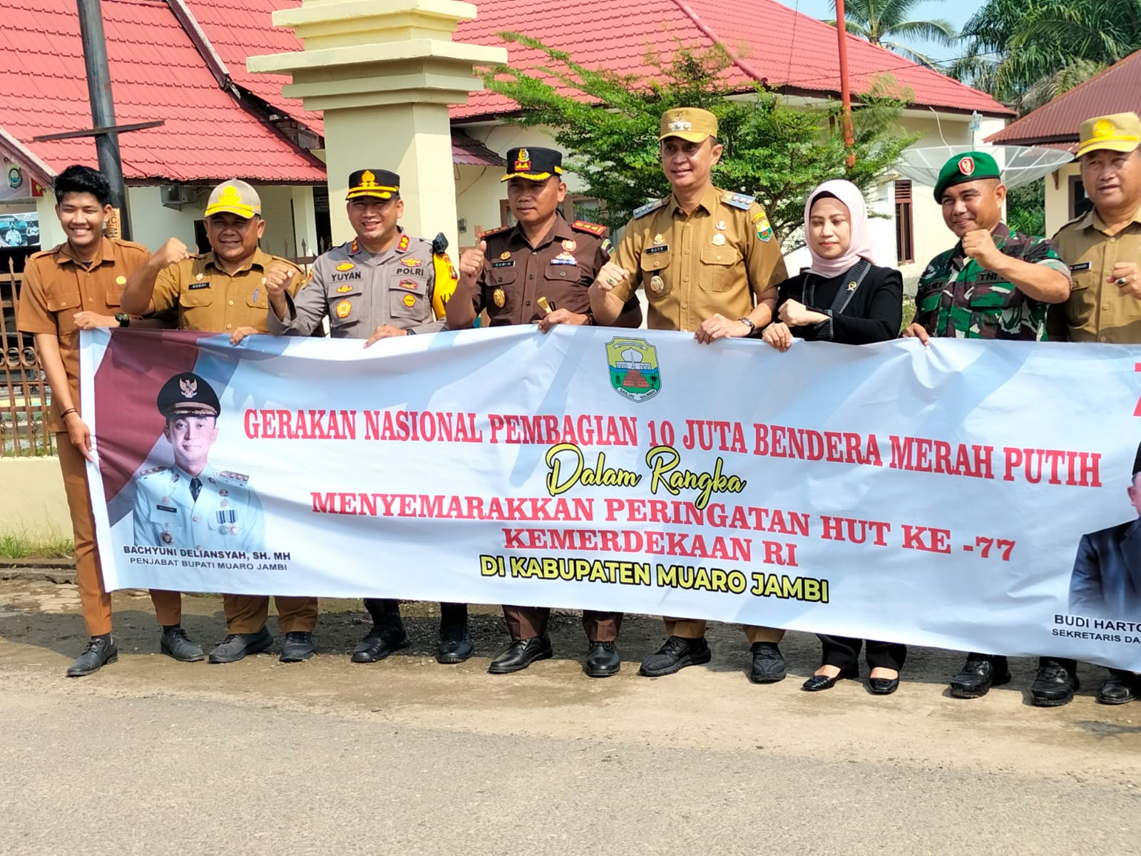 Untuk menyemarakkan HUT RI 77 untuk mensukseskan gerakan nasional pembagian 10 juta bendera merah putih dalam rangka menyemarakkan peringatan HUT RI ke-77, Pj Bupati Muaro Jambi Bachyuni Deliansyah memberikan ribuan bendera merah putih. “Ribuan bendera merah putih itu dibagikan kepada masyarakat dan pengguna jalan yang melintas dikawasan Sengeti. (08/08).