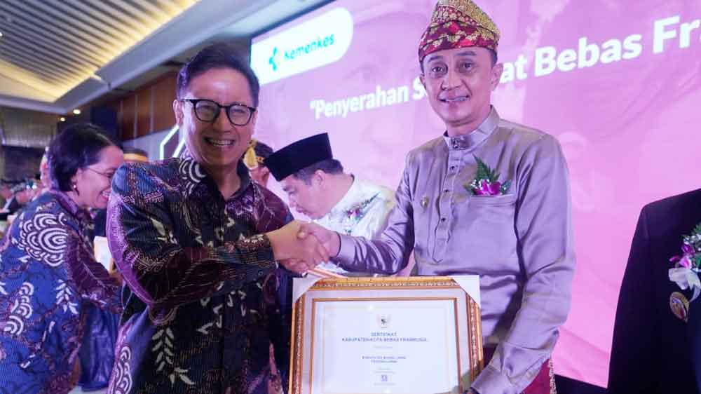 Sertifikat diterima langsung oleh Pj Bupati Bachyuni Deliansyah dari Menkes, Budi Gunadi Sadikin yang didampingi oleh Dirjen Pencegahan dan Pengendalian Penyakit (P2P) Maxi Rein Rondonuwu.