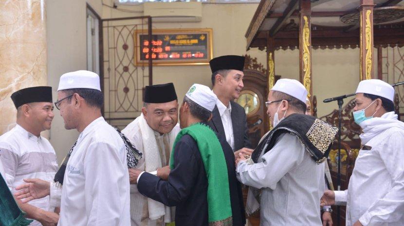 Pj Bupati Bachyuni mengucapkan selamat hari raya Idul Adha 1443 Hijriah di depan masyarakat dan jamaah yang ikut shalat secara berjamaah di Masjid Agung Al-Abror.