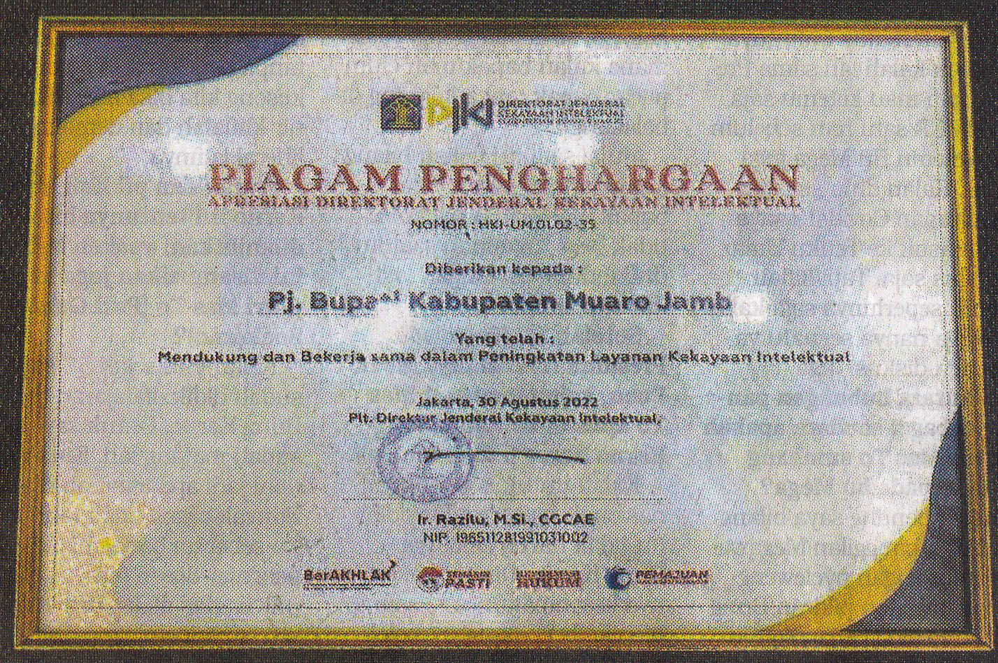 Penghargaan Peduli Kekayaan Intelektual diserahkan langsung Dirjen Kekayaan Intelektual Ir.Razilu. M.Si.,CGCAE kepada Pemerintah Kabupaten Muaro Jambi yang diterima langsung oleh Staf Ahli Bupati Muaro Jambi yang mewakili Pj Bupati Muaro Jambi, Bachyuni Deliansyah.