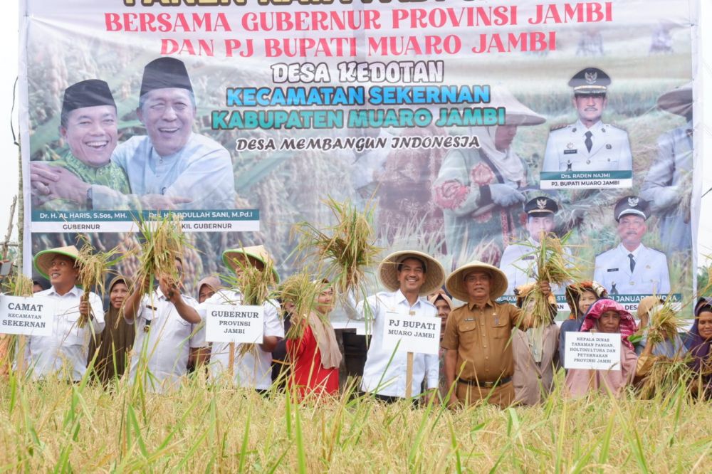 Penjabat Bupati Muaro Jambi Drs. Raden Najmi secara langsung turun ke sawah dan ikut memanen padi bersama petani di Desa Kedotan, Kecamatan Sekernan, Rabu (03/09/24) .