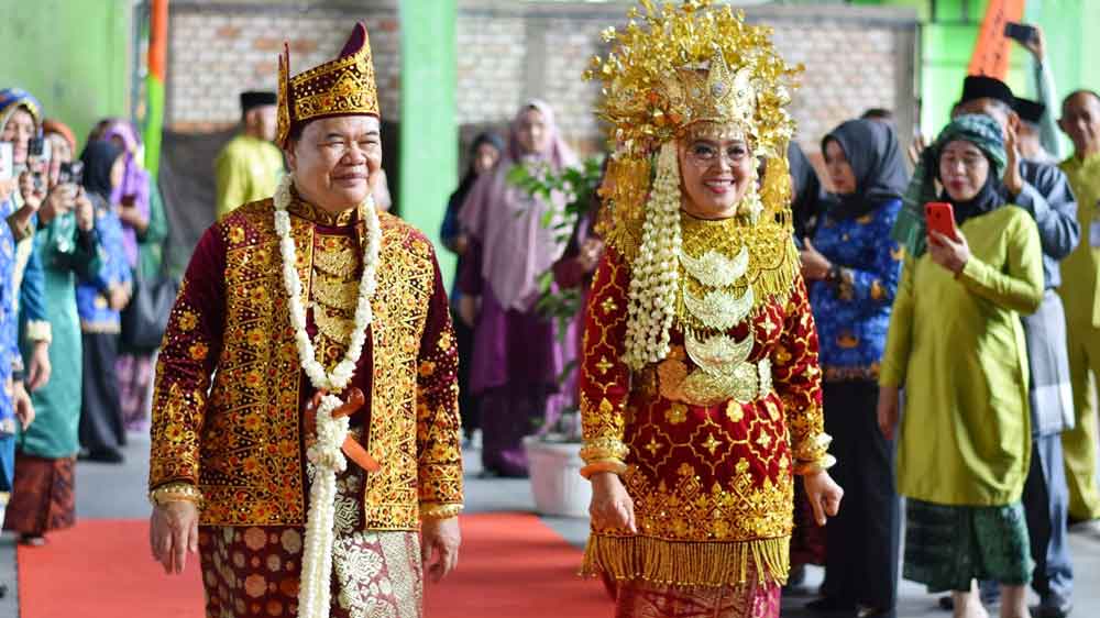 Sri Purwaningsih tampak mengenakan baju ada khas Jambi, bernama kurung tanggung, bewarna merah dan bermahkota bewarna emas teruntai melati.