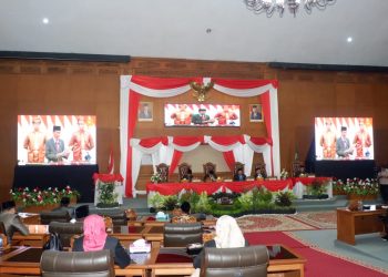 SUMATERADEFACTO.ID | Kab. Muaro Jambi Penjabat Bupati Muaro Jambi, Raden Najmi, menghadiri Rapat Paripurna DPRD Kabupaten Muaro Jambi untuk mendengarkan ...