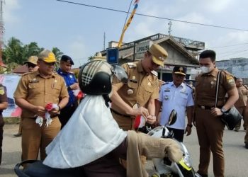 Pj Bupati Muaro Jambi Membagikan Bendera Merah Putih ke Pengguna Jalan
