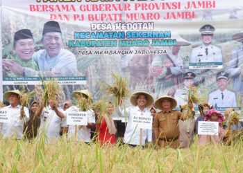 SUMATERADEFACTO.ID | Kab. Muaro Jambi Penjabat Bupati Muaro Jambi Drs. Raden Najmi secara langsung turun ke sawah dan ikut memanen padi bersama petani di ...