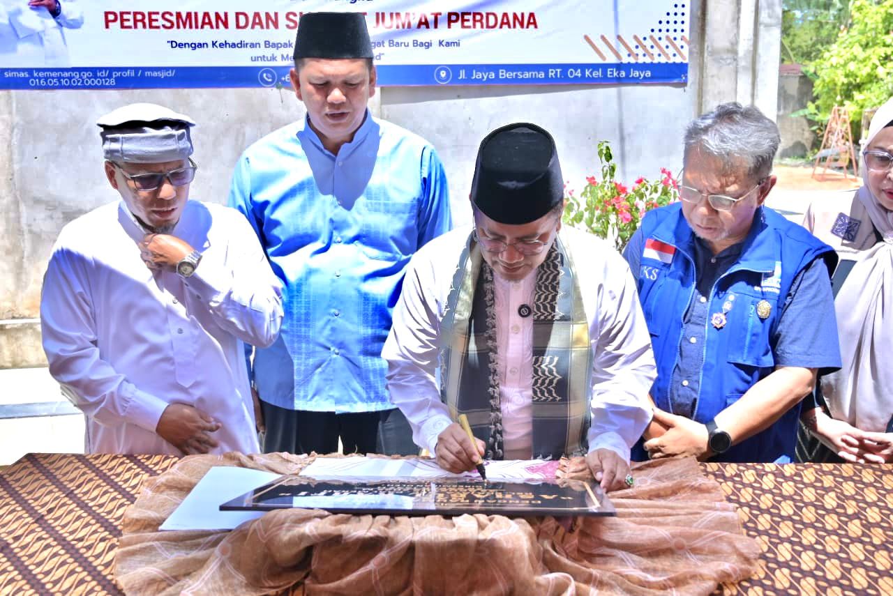 Wali Kota Jambi, Dr. dr. H. Maulana, M.K.M., meresmikan Masjid Ashabul Kahfi yang berlokasi di Jalan Jaya Bersama I, RT 04, Kelurahan Eka Jaya, Kecamatan Paal Merah, pada Jumat siang (22/8/2025). Peresmian ditandai dengan penandatanganan prasasti oleh Wali Kota usai dirinya memimpin shalat Jumat perdana sebagai imam sekaligus khatib di masjid tersebut.